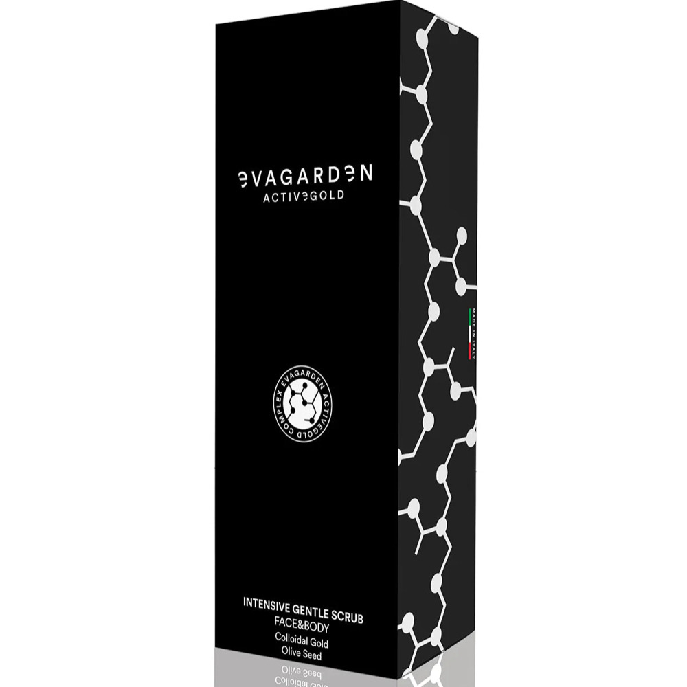EVAGARDEN EASYSCRUB COMPLEX: Olivenkjerner, merianvann, aloe vera og hydroliserte druer kombinert gjør ACTIVEGOLD-serien enda mer intens og kraftig, med en overraskende eksfolierende, fuktighetsgivende og nærende effekt!